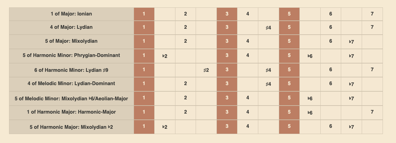 - 五条七音Parent Scale, 到目前为止有五条七音主音阶和其下的modes。以及一些非七音的和弦。应该能满足绝大多数的情况。