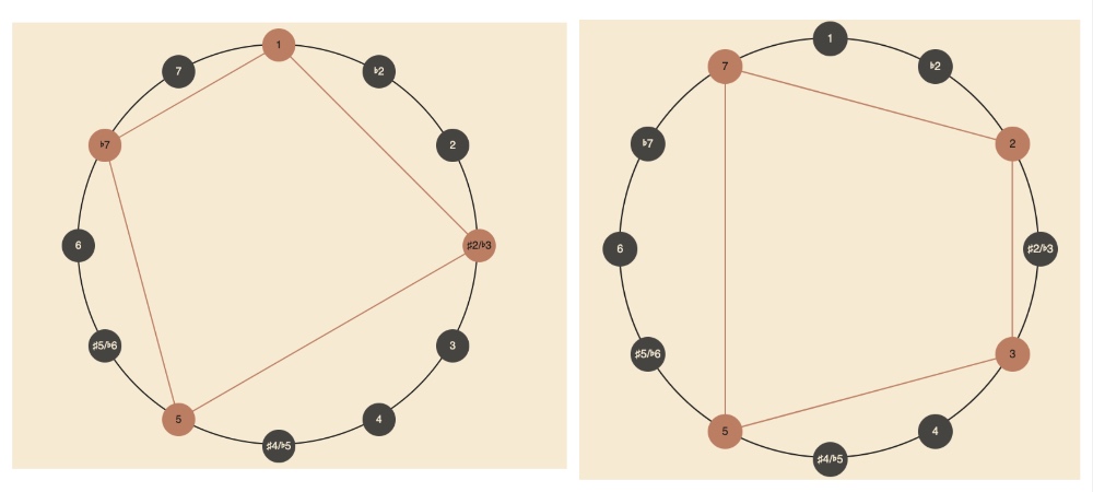 More importantly, this tool helps you understand how a pitch set functions over different chords. For instance, over a major seventh chord, you can play a minor seventh chord starting on the 3rd degree. If you select 1–♭3–5–♭7 on the clock and reinterpret the root of the minor seventh as the 3rd of a major seventh chord, you’ll realize you’re actually playing the 3–5–7–9 of a major seventh—a common and beautiful upper-structure voicing.