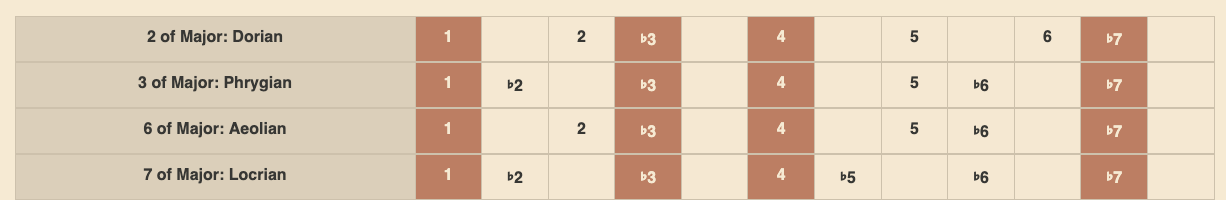 A classic example is the set 1–♭3–4–♭7. This group of notes exists in four different modes of the major scale, which means you can shift it in parallel four times and still remain entirely within the scale.